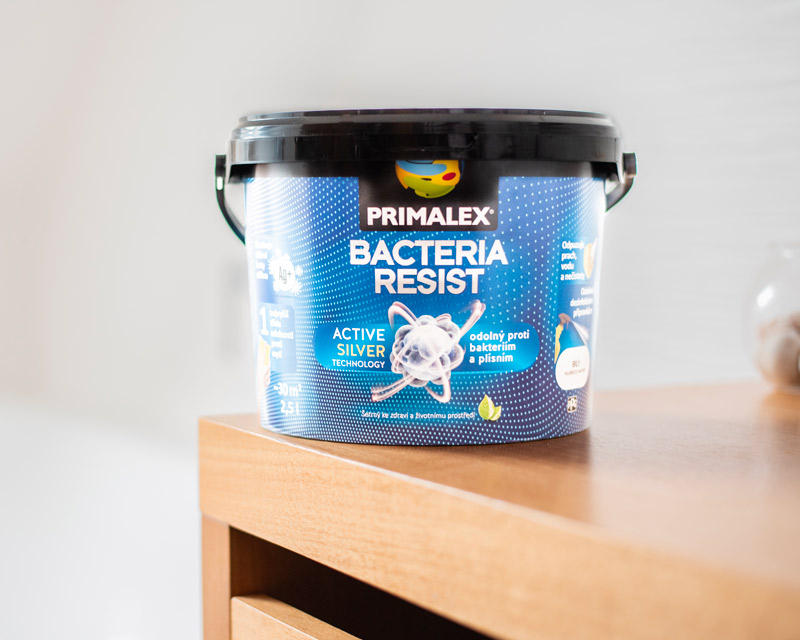Rodiny s deťmi a domácimi zvieratami ocenia Primalex Bacteria Resist. Táto farba novej generácie je najlepšou voľbou pre tých, ktorí vyžadujú vysokú úroveň hygieny v interiéri. Vďaka technológii ACTIVE SILVER odoláva množeniu baktérií na povrchu náteru a chráni steny pred napadnutím riasami a plesňami. Primalex Bacteria Resist je odolný aj voči dezinfekčným prostriedkom. Môže sa aplikovať v priestoroch, kde sa nachádzajú najmä deti a ľudia so zníženou imunitou, ale aj alergici a starší ľudia. Je vhodný aj pre nemocnice, lekárske a veterinárne kliniky, hotely alebo reštaurácie.