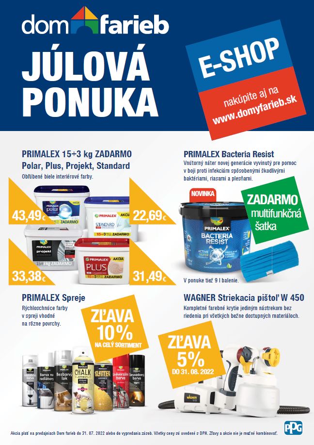 Aj v júli máme pre Vás ponuku produktov, ktoré môžete nakúpiť za akciové ceny na e-shope alebo v našich predajniach Dom farieb.