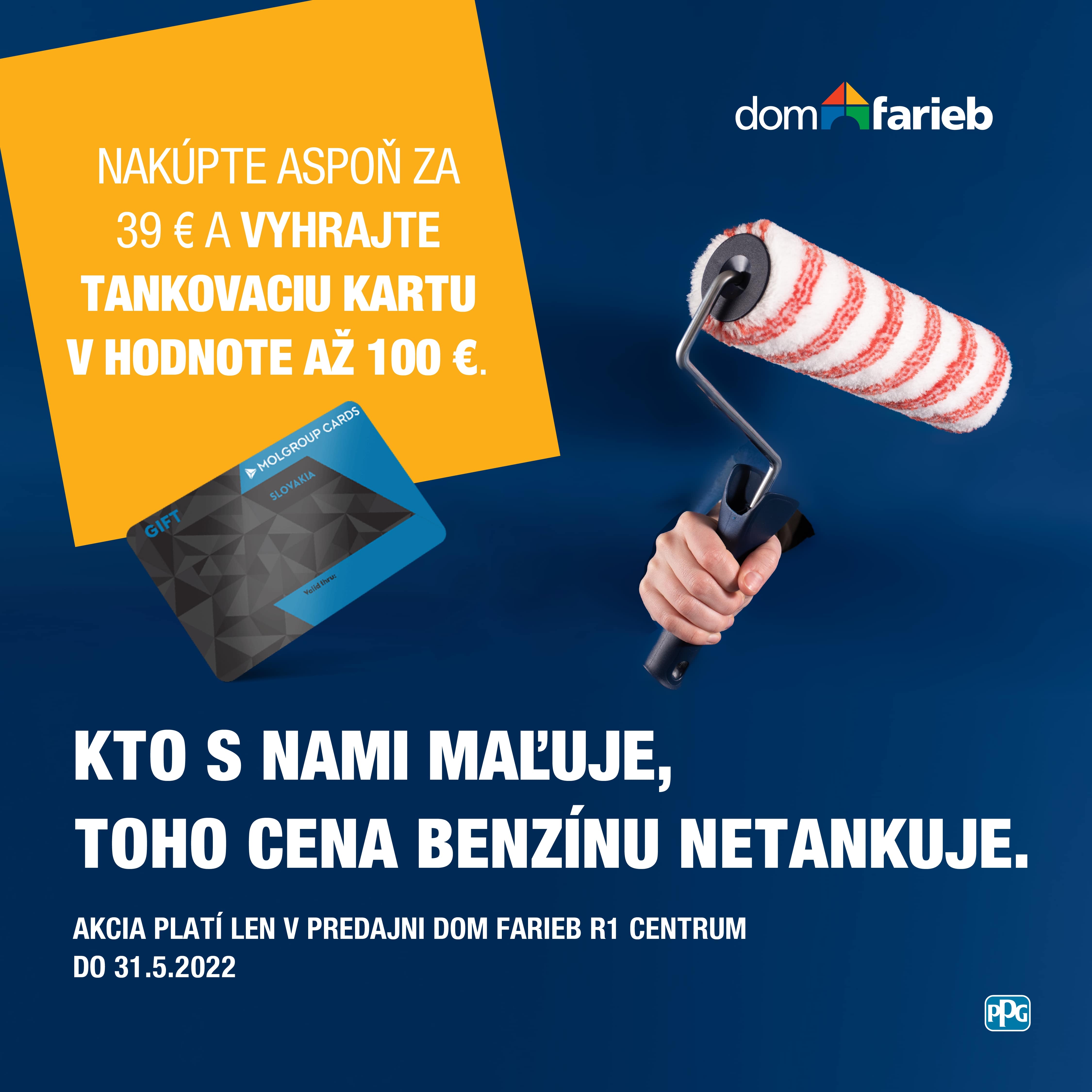 Nakúpte v našej kamennej predajni Dom farieb Bratislava R1 v hodnote aspoň 39 € s DPH a zapojte sa do súťaže o zlosovanie tankovacej karty MOL group v hodnote až 100 € s DPH.