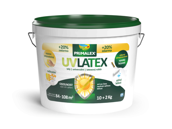 Primalex UV LATEX je matný, žiarivo biely náter s vysokou odolnosťou voči oderu za mokra a umývateľnosťou (trieda 2). Má vynikajúcu paropriepustnosť a kryciu schopnosť.