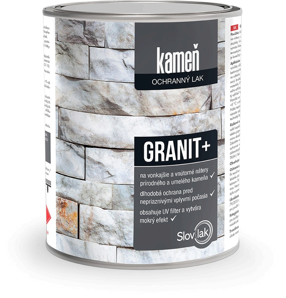 Granit + lak na kameň je vysoko kvalitný bezfarebný lak vhodný na ošetrenie prírodného kameňa ako je žula, bridlica, vápenec a umelého kameňa, tiež na nátery umelých stavebných materiálov ako sú tehly, betón a dekoratívne sadrové doplnky.