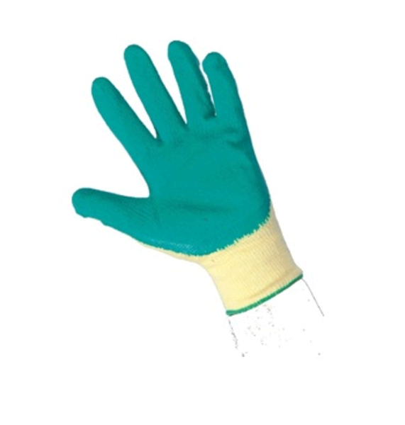 Rukavica pletená, máčaná v latexe, 65 % polyester, 35 % bavlna, latex.