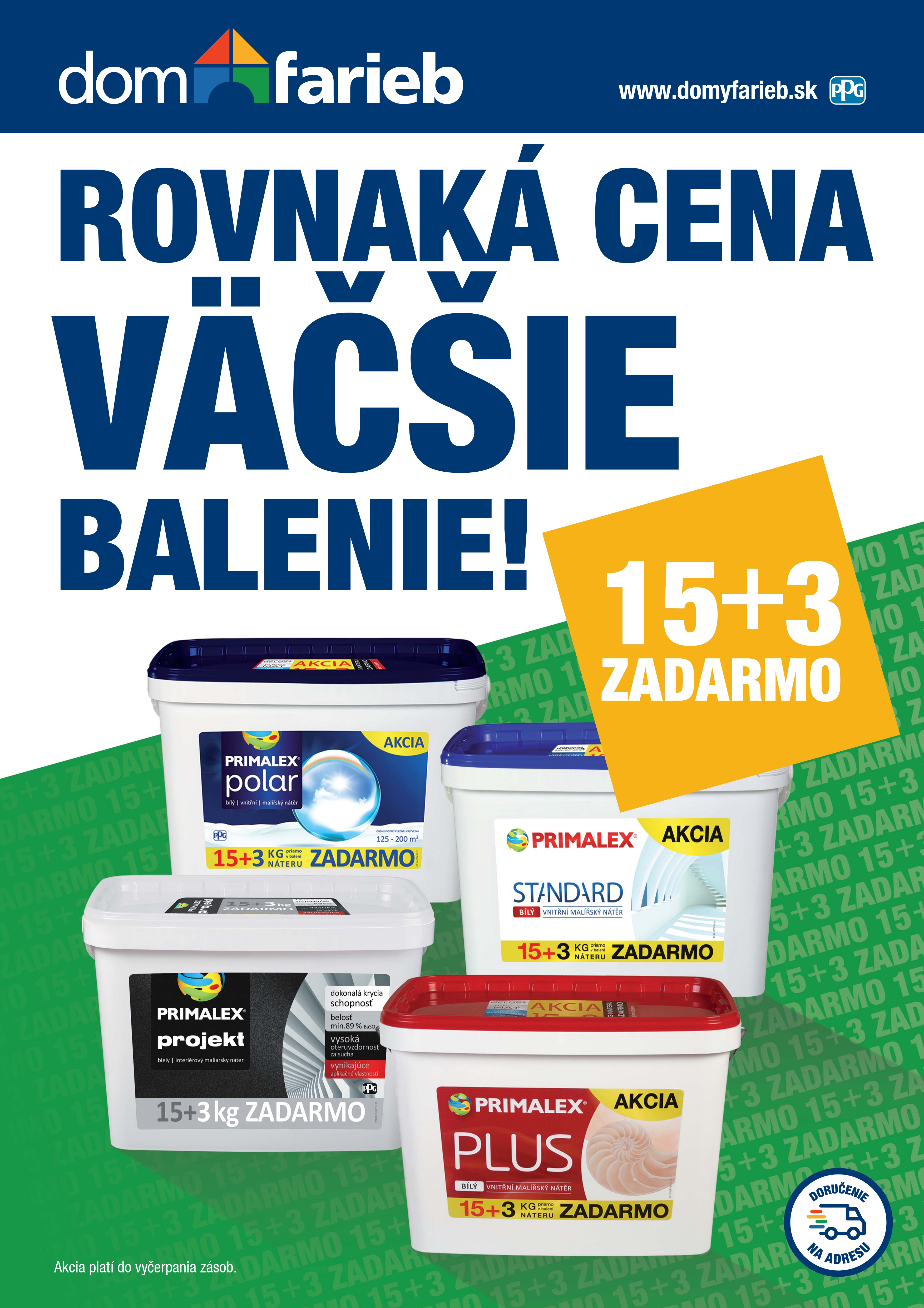 Od apríla nakúpite výhodné balenia 15+3 kg zadarmo nielen na našich predajniach Dom farieb, ale aj v našom e-shope. Vo výhodnom balení nájdete tieto obľúbené produkty: